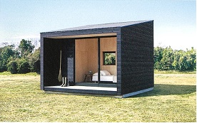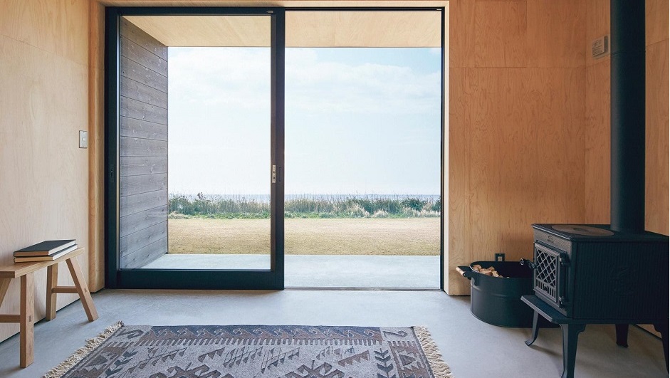 小屋で使用する木材は100%国産にこだわり、外壁は海の町・白浜らしく焼杉板。これは杉材を焼くことで耐久性を高める昔ながら技法で、その上にオイルステインを塗装することでより強化されています。屋内については、無塗装にしていますので、ペンキや壁紙などご自由に改装して頂くことが可能です。基礎部分には一般住宅で使われるベタ基礎を採用しました。強度があり、地面からの湿気の侵入を防ぐ目的です。床面は、屋内も縁側部分もモルタル仕上げ。靴でも裸足でも使いやすく、凹凸がないので掃除も簡単。部分的に床板やカーペットを敷いて床を仕切ることで、土間スペースを作ることもできます。
