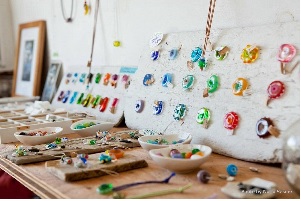 シラハマ校舎に店舗兼工房を構える「Glass Drop」。シラハママーケットの当日は体験ワークショップをお休みし、ガラス(トンボ玉)を使ったアクセサリーやダイタイ染の七色手拭いの展示・販売を行います。