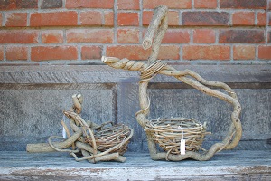 地元の山のツルを使ってかごを作っています。クズ・アケビ・カズラ・フジなど様々な太さのツルの弾力や曲がり具合をみながら採取し、丁寧に編んでいます。自然の形を活かしているので、全ての作品が一点もの。ワイヤーを使用していないため、最後はそのまま自然に還すことができるのも特長です。 |
