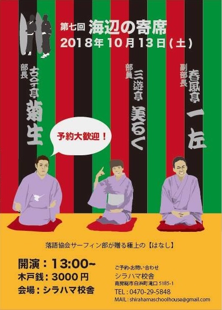 人気イベント「海辺の寄席」がわが町・白浜へ帰ってきます! 演者はおなじみ、落語協会サーフィン部に所属する古今亭 菊生さん(部長)、春風亭 一左さん(副部長)、部員:三遊亭 美るくさん(部員)の3名。とっておきの"はなし"を披露してくれます。